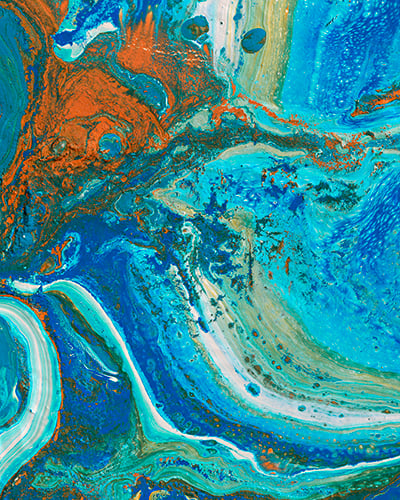 Created using a combination of paint layering via paint pouring, blow-drying and dripping together with digital manipulation.